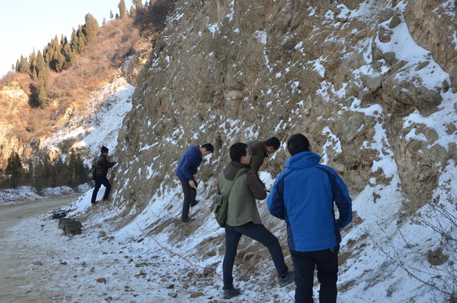 驪山梁上積雪未消,隊(duì)員們冒著零下3℃的低溫認(rèn)真的測量地質(zhì)剖面。他們分工明確,有人拉皮尺,有人定巖性,有人管記錄。寒風(fēng)吹過參賽隊(duì)員的臉頰,他們毫無知覺,一心一意專注于比賽之中。擂臺之上比速度,實(shí)戰(zhàn)之中看技能,這樣的比賽場面,也展示著地質(zhì)隊(duì)員精益求精的工作態(tài)度。