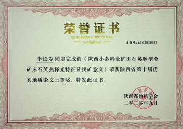 由我公司地調(diào)所編制完成的“小秦嶺金礦田深部及外圍金礦整裝勘查區(qū)(陜西)礦產(chǎn)調(diào)查找礦預(yù)測(cè)子項(xiàng)目(石門(mén)幅)成果報(bào)告”獲陜西省第十屆優(yōu)秀地質(zhì)成果三等獎(jiǎng);張歡歡同志撰寫(xiě)的“陜西小秦嶺金礦床三位一體勘查區(qū)找礦預(yù)測(cè)地質(zhì)模型及找礦意義”獲優(yōu)秀地質(zhì)論文一等獎(jiǎng);李長(zhǎng)壽同志撰寫(xiě)的“陜西小秦嶺金礦田石英脈型金礦床石英熱釋光特征及其找礦意義”獲優(yōu)秀地質(zhì)論文三等獎(jiǎng)。