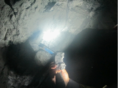 休息了好一會,我們又開始向硐子的縱深行進(jìn),全然忘記了我們怎么回來。又行進(jìn)了300多米,我們到達(dá)了今早出露的含金石英脈帶,寬約40厘米。大家都興奮異常,互相祝賀,紛紛站在礦脈帶照相留念,2000米行進(jìn)的辛苦情緒一掃而空。