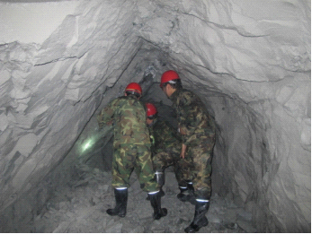走進(jìn)平硐,硐中空氣比較新鮮,地面水不多、尚且平整,劉總經(jīng)常下井,行走很快。一路上,我們跌跌撞撞,250坑道明顯沒有上周五下過的898豎井坑道標(biāo)準(zhǔn),坑道不平整,局部地方高度只有1米8多左右,學(xué)習(xí)小組成員都不小心被磕著,幸好帶有有安全帽,不然就見血了。在1300多米的平硐中,劉總、董經(jīng)理和譚坑長給我們介紹著洞壁上的巖石、巖性和破碎構(gòu)造帶、石英脈侵入等地質(zhì)現(xiàn)象,我們受益非淺。