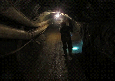 我們選擇走右坑道,前往早上見礦段,很快來到了第一級斜井,標(biāo)稱坡長120米、坡度28度,這兩個數(shù)字在地面上顯得很平常,可是在井下,顯得很長、很陡,更何況斜井由于要向上運(yùn)料,沒有臺階,只是平平的坡。