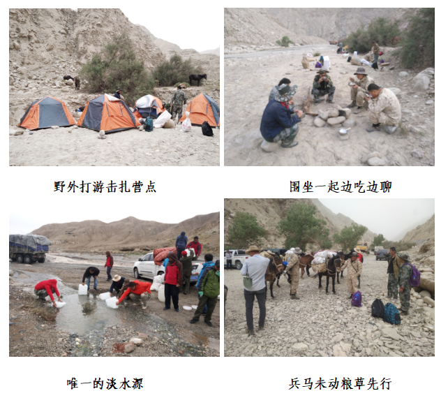 由于工區(qū)面積較大,采樣難度因地形所限超乎預(yù)期,許多地方不能當天返回駐地,我們只能采用“打游擊”(騾子馱帳篷,走哪住哪)的方式進行。于是茫茫阿爾金山便是我們的床,浪漫星空便是我們的被,與阿爾金山野驢為伴,別說還真有點野性。然而吃飯卻是最大的問題,自帶的淡水僅能維持兩日,后面的日子就只能用燒開的咸水煮方便面、下掛面,或者索性用馕充饑。為了能按時完成任務(wù),項目人員餐風沐雨,齊心協(xié)力,從不叫苦。