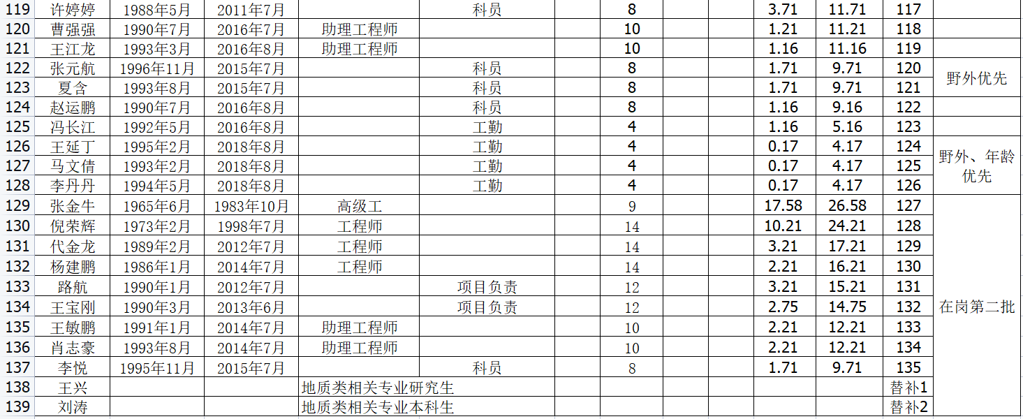 截至2021年底,我公司現(xiàn)有在冊(cè)職工421人,其中事業(yè)身份373人,企業(yè)身份48人。在崗職工182人,下崗及內(nèi)退239。各類專業(yè)技術(shù)人員116人,其中地質(zhì)類專業(yè)技術(shù)人員83人,其他專業(yè)技術(shù)人員33人。教授級(jí)高工1人,高級(jí)工程師22人,工程師41人;初級(jí)及以下52人,管理人員16人,工人289人,其中技師15人。